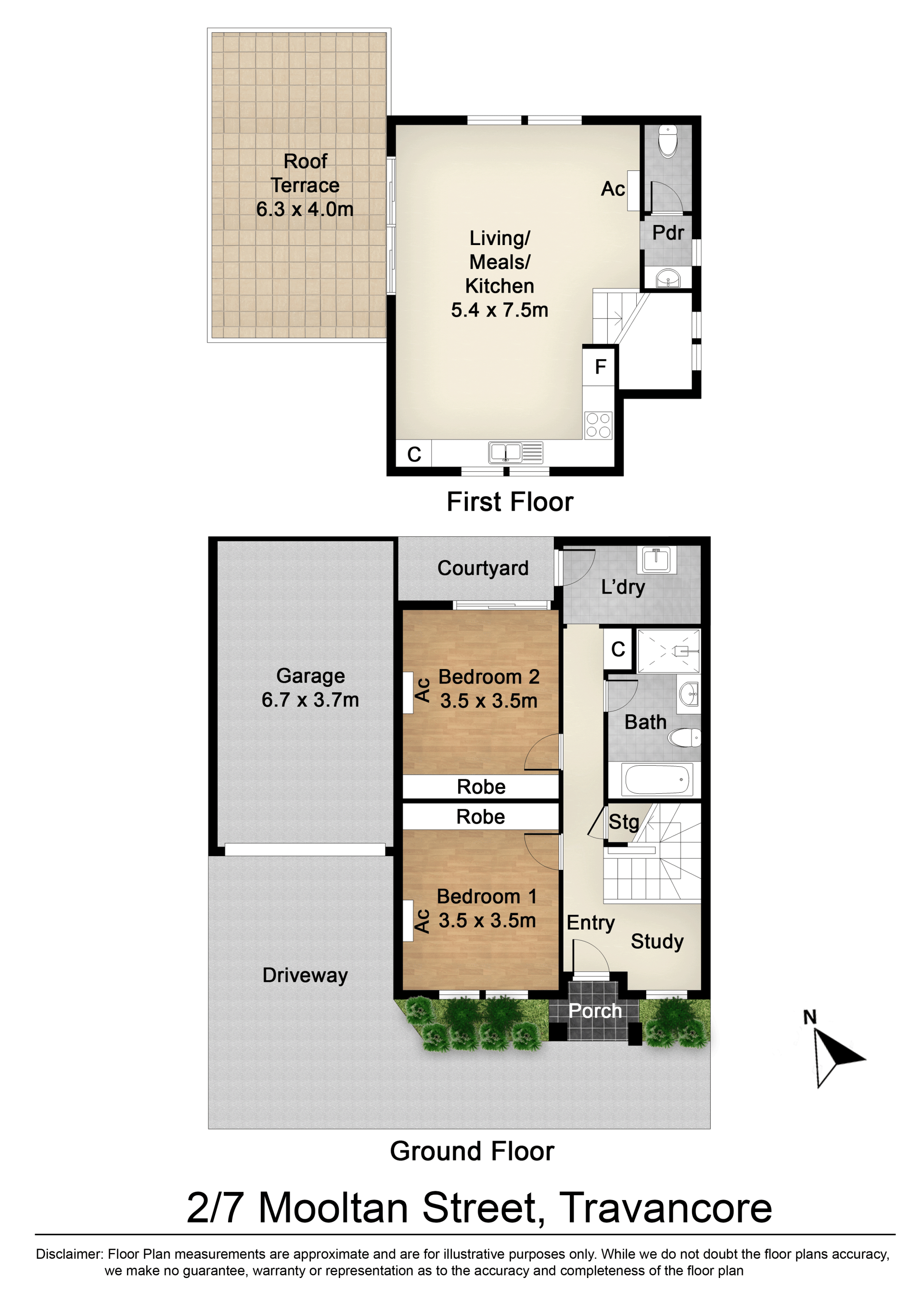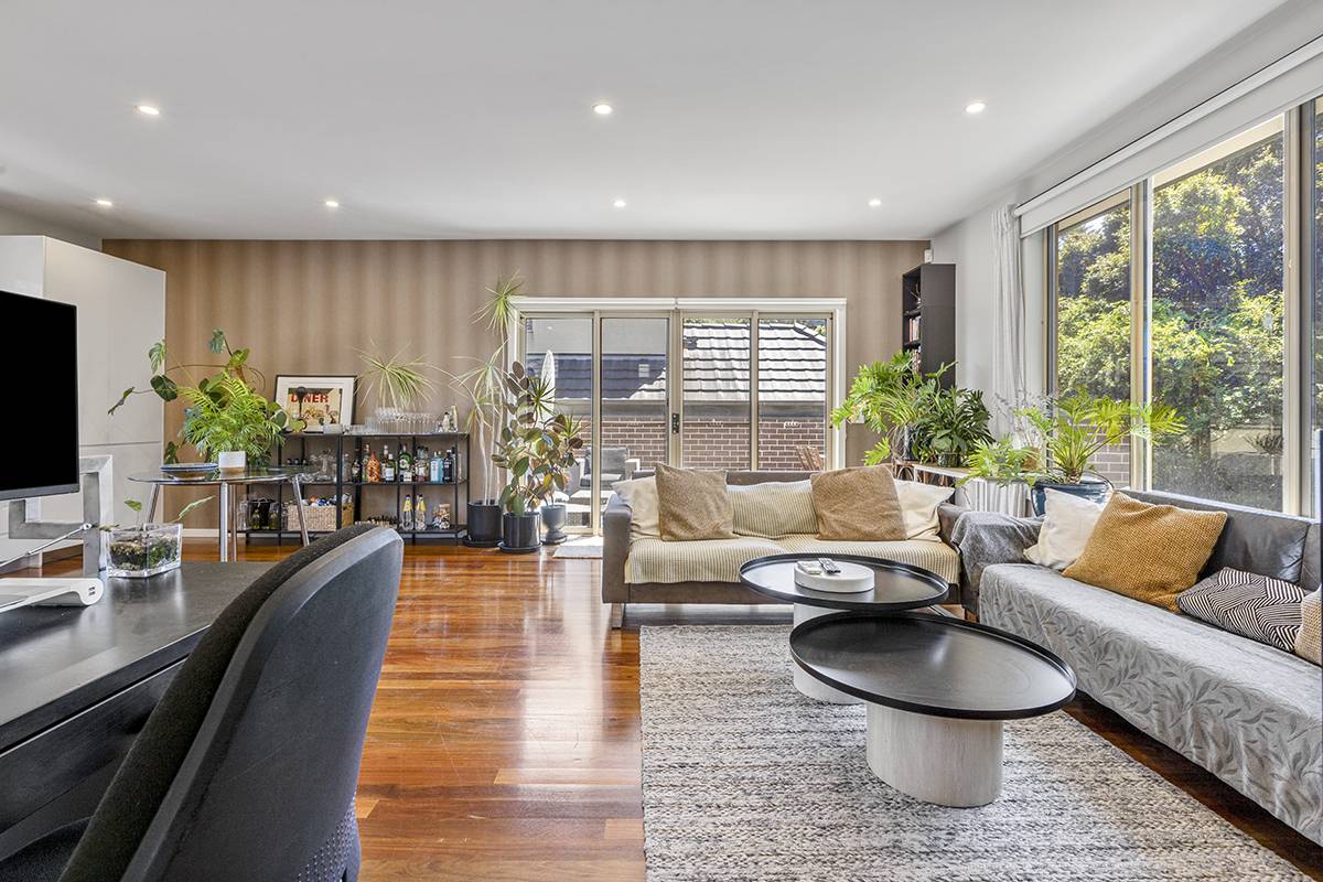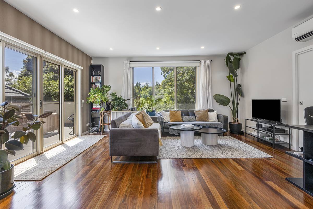 Perfectly located this cutting-edge residence offers a cleverly designed layout with lovely earthy modern tones throughout featuring spotted gum flooring, high 2.7M ceilings and double glazing just to mention a few. On the first floor you will be amazed at the spacious open plan kitchen with living room and the beautiful leafy outlook from all windows. Open the double glass doors and step out to your own private entertainment terrace for a morning coffee or to capture the cool afternoon breeze. Both of the 2 bedrooms are on the ground level with robes and are serviced by a modern fully tiled bathroom with separate shower and bath. There is a perfect size study alcove near the entrance, ideal for work from home. The 2nd bedroom has access to a small courtyard and there is a traditional separate laundry and lots of under stair storage.